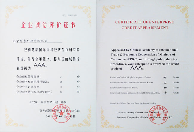 此次北京邦永科技有限公司“AAA”企業(yè)誠信評價證書的取得,是商務(wù)部國際貿(mào)易經(jīng)濟(jì)合作研究院對我司誠實(shí)守信、客戶至上經(jīng)營理念的充分肯定。同時,我司也將不負(fù)厚望,不斷努力創(chuàng)新,為廣大客戶提供更加優(yōu)質(zhì)的產(chǎn)品與服務(wù),樹立重質(zhì)量、守信用企業(yè)的良好形象。